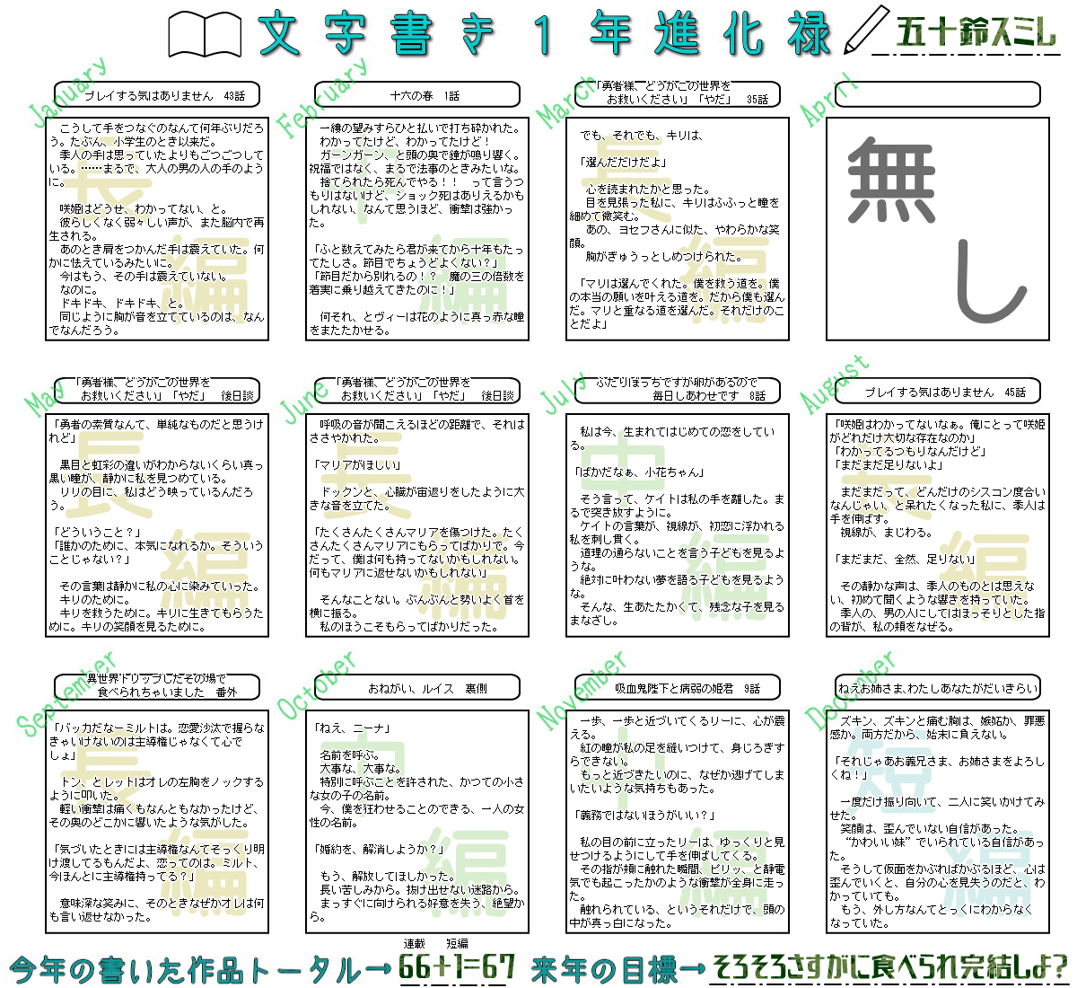 なろうさんのほうで、憧れだった企画も開催することができ、とても楽しかったと同時に学ぶことも多かったです。ご参加くださったみなさま本当にありがとうございました!